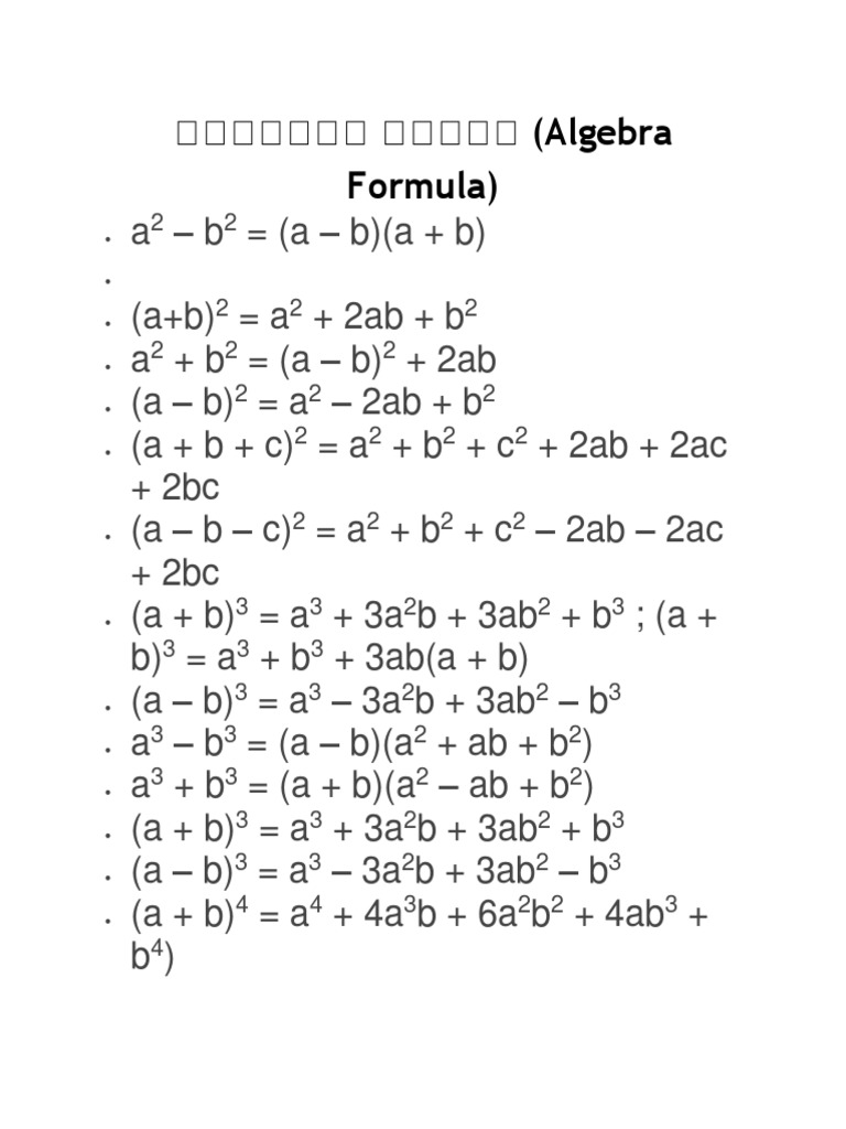 A 3 3a 2 b 3ab 2 b 3 a b a 4 4a 3 b 6a 2 b 2 4ab 3 b 4 the calculations get longer and longer as we go but there is some kind of pattern developing. If and are the roots of the equation ax2 bx c 0 a6 0then i b a coe. Now i am going to explain everything below. Formula sheet math 1060 004 trigonometry the following formulas will be provided on the final test.