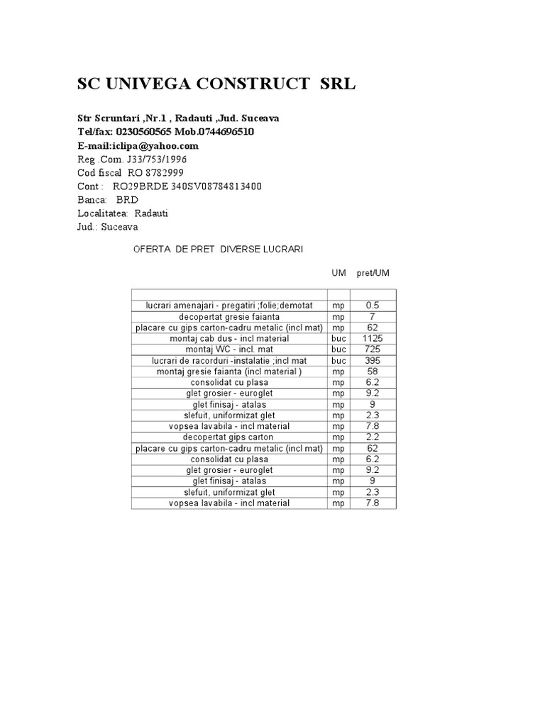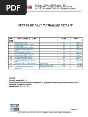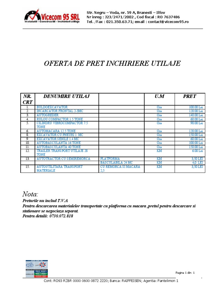 Model Oferta De Pret Inchiriere Utilaje