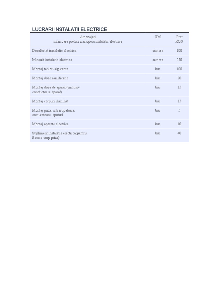 Pret Manopera Instalatie Electrica 2018